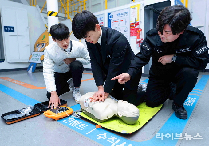 특히 이날 HD현대중공업은 윤재준 군의 아버지인 윤형민 기사(HD현대중공업 안전보건지원부, 특수구조대원)가 강사로 나선 특별 안전 교육을 마련해 행사의 의미를 더했다. 윤형민 기사는 특수구조대원으로서의 경험담과 심장제세동기(AED) 및 소화기 사용법, 화재 대피법 등을 소개하고 두 학생을 격려했다.