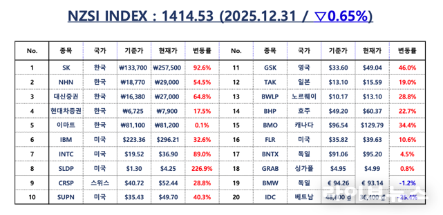 이날 NZSI INDEX는 0.65% 하락한 1,414.53포인트로 마감하며 5거래일 연속 약세를 보였다. 연말 기준 한국 대표 5개 종목의 누적 상승률은 47.99%였으며, 배당을 포함한 총수익률은 51.69%에 달했다. 글로벌 대표 15개 종목은 누적 상승률 39.28%, 배당 포함 42.65%로 집계됐다. 한국 시장의 장기 성과 우위는 연말까지 유지되는 흐름이었다.