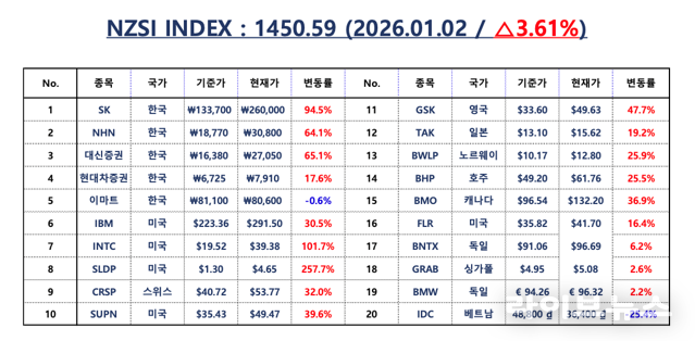 이날 NZSI INDEX는 3.61% 상승한 1,450.59포인트로 마감하며 5거래일 연속 이어졌던 약세 흐름을 마무리하고 상승 전환했다. 한국 대표 5개 종목의 누적 상승률은 50.22%였으며, 배당을 포함한 총수익률은 53.92%에 달했다.