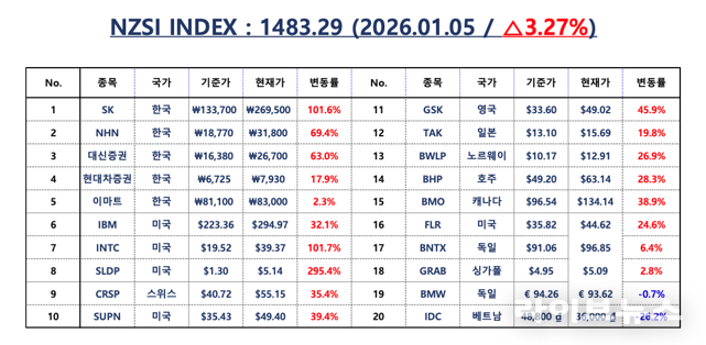 이날 NZSI INDEX는 3.27% 상승한 1,483.29포인트로 마감하며 상승 흐름을 이어갔다. 한국 대표 5개 종목의 누적 상승률은 52.93%였고, 배당을 포함한 총수익률은 56.63%로 집계됐다. 글로벌 대표 15개 종목은 누적 상승률 46.80%, 배당 포함 50.17%를 기록했다. 한국 시장의 성과 우위는 유지되고 있지만, 상승 격차는 점차 줄어드는 흐름이 나타나고 있다.