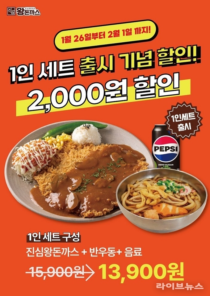 이와 함께 진심왕돈까스는 연초 소비자 체감형 기획으로 ‘1인 세트 메뉴’ 출시 기념 할인 행사도 진행한다. 이번 1인 세트는 대표 메뉴인 진심왕돈까스에 세트 전용 신메뉴인 반우동, 음료 1캔을 더한 구성으로, 혼자서도 부담 없이 ‘제대로 된 한 끼’를 즐길 수 있도록 기획됐다. 할인 행사는 1월 26일부터 2월 1일까지 총 7일간 진행되며, 관련 홍보는 1월 19일부터 사전 일괄 안내될 예정이다.