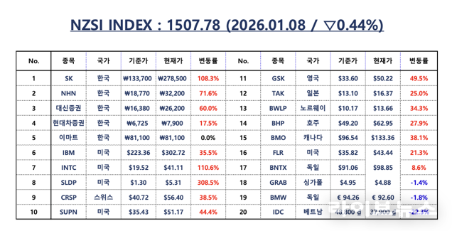 이날 NZSI INDEX는 0.44% 하락한 1,507.78포인트로 마감하며 하락 흐름을 이어갔다. 한국 대표 5개 종목의 누적 상승률은 53.54%, 배당을 포함한 총수익률은 57.24%로 집계됐다. 글로벌 대표 15개 종목은 누적 상승률 49.86%, 배당 포함53.24%를 기록했다. 한국 시장의 성과 우위는 유지되고 있지만, 글로벌 시장과의 격차는 다시 축소되는 흐름이다.