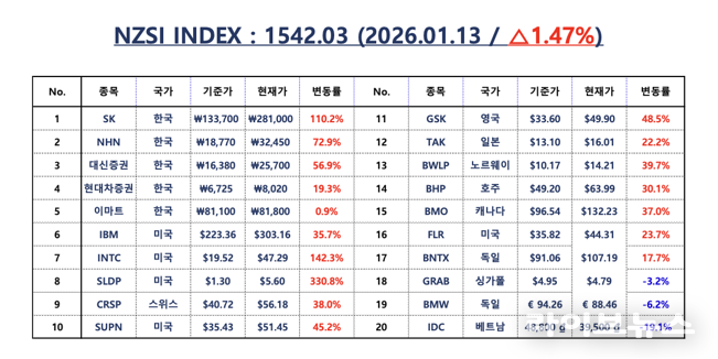 이날 NZSI INDEX는 1.47% 상승한 1,527.35포인트로 마감하며 3거래일 연속 상승 흐름을 이어갔다. 한국 대표 5개 종목의 누적 상승률은 54.09%, 배당을 포함한 총수익률은 57.80%로 집계됐다. 글로벌 대표 15개 종목은 누적 상승률54.24%, 배당 포함 57.62%를 기록했다. 한국 시장과 글로벌 시장의 성과가 비슷한 흐름을 보이고 있다.