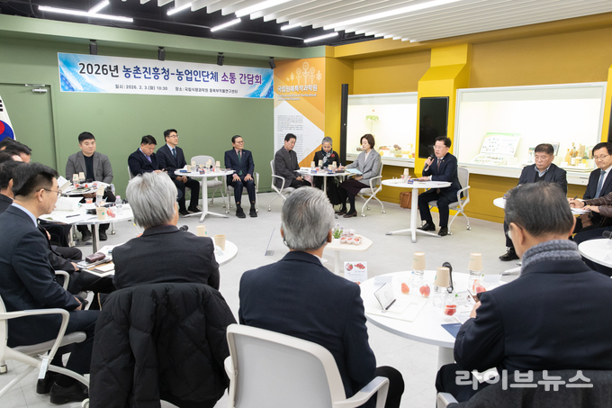 이승돈 농촌진흥청장은 3일 오전 국립식량과학원 중북부작물연구센터(경기도 수원시)에서 한국농축산연합회 이승호 회장을 비롯한 농업인단체장과 간담회를 갖고, 2026년 업무 계획 공유 및 농업 현안을 논의했다.