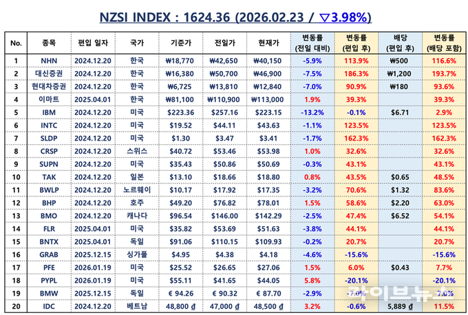 NZSI INDEX는 3.98% 하락한 1,624.36포인트를 기록하며 단기 조정을 나타냈다. 그러나 구조적으로는 한국 대표 4개 종목이 126.57%, 배당 포함 기준 130.28% 상승을 기록하며 글로벌 대표 16개 종목 상승률 44.97%, 배당 포함 48.60% 대비 2배 이상 높은 초과 성과를 이어가고 있다. 이는 단순한 유동성 장세를 넘어 구조적 경쟁력 기반의 상승이 진행되고 있음을 의미한다.