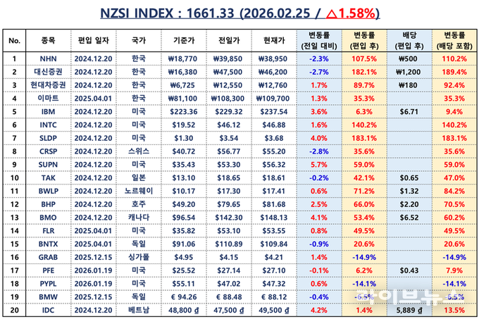 NZSI INDEX는 1.58% 상승한 1,661.33포인트를 기록하며 상승을 이어갔다. 한국 대표 4개 종목은 122.59%, 배당 포함 기준 126.30% 상승을 기록하며 글로벌 대표 16개 종목 상승률 50.59%, 배당 포함 54.21% 대비 2배 이상의 초과 성과를 이어가고 있다. 이는 한국 시장이 단순한 회복 국면을 넘어 구조적 재평가 국면에 진입했음을 시사한다.