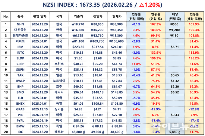 NZSI INDEX는 1.20% 상승한 1,673.35포인트를 기록하며 상승 흐름을 이어갔다. 한국 대표 4개 종목은 124.14%, 배당 포함 기준 127.85% 상승을 기록했고, 글로벌 대표 16개 종목 상승률 51.70%, 배당 포함 55.33% 대비 2배 이상의 초과 성과를 이어가고 있다. 이는 한국 시장으로의 자금 집중과 구조적 리레이팅이 동시에 진행되고 있음을 보여준다.