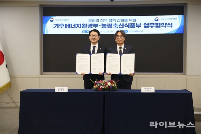 농림축산식품부(장관 송미령)와 기후에너지환경부(장관 김성환)는 4일 정부세종청사에서 환경정책과 농업정책을 연계한 물관리 정책 협력 강화를 위한 업무협약(MOU)을 체결했다고 밝혔다.