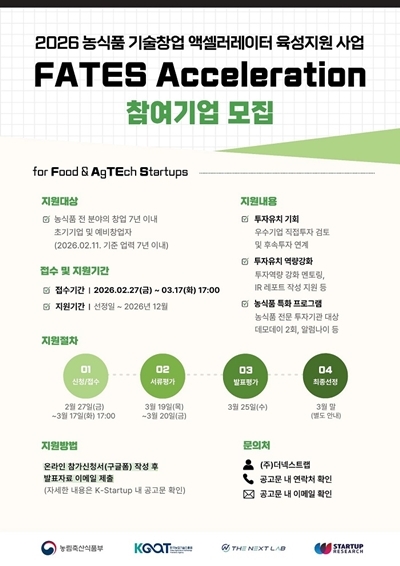 지난해에 이어 농림축산식품부가 주최하고 한국농업기술진흥원이 주관하는 ‘2026 농식품 기술창업 액셀러레이터 육성지원’의 운영 액셀러레이터로 선정된 더넥스트랩과 스타트업리서치는 3년 연속 본 프로그램을 운영하며, 투자유치를 통한 Scale-up을 희망하는 농식품 전 분야의 업력 7년 이내 기술 융•복합 (예비)창업자를 모집한다.