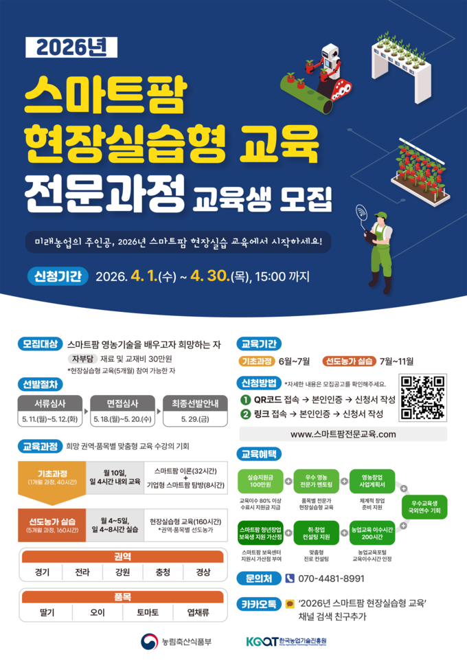 한국농업기술진흥원(원장 이석형)이 4월 1일부터 ‘스마트팜 현장 실습형 교육’ 교육생을 모집한다. 이번 교육은 농림축산식품부 주관으로 농진원이 운영하며, 실제 농사를 짓는 선도 농가에서 실습 중심으로 진행하는 점이 특징이다.