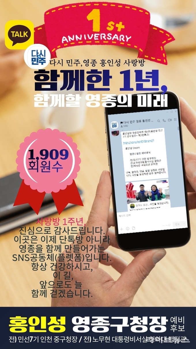 ‘다시 민주, 영종 홍인성 사랑방’은 지난해 4월 5일 홍인성 전 중구청장을 지지하는 시민들이 자발적으로 모여 개설된 온라인 커뮤니티로, 현재 약 1,900여 명의 회원이 참여하고 있다.