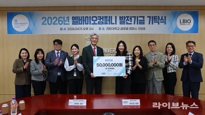 겐트대 글로벌캠퍼스는 13일 교내 대회의실에서 발전기금 기탁식을 열고, 산학협력단 첫 수익 5천만 원을 전액 학생 장학금으로 활용하기로 결정했다고 밝혔다.
