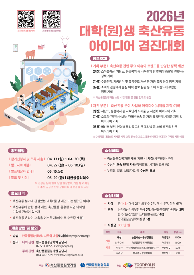 축평원은 13일부터 ‘2026년 대학(원)생 축산유통 아이디어 경진대회’를 개최하고, 정책 제안과 사업화 아이디어를 공모한다고 밝혔다.