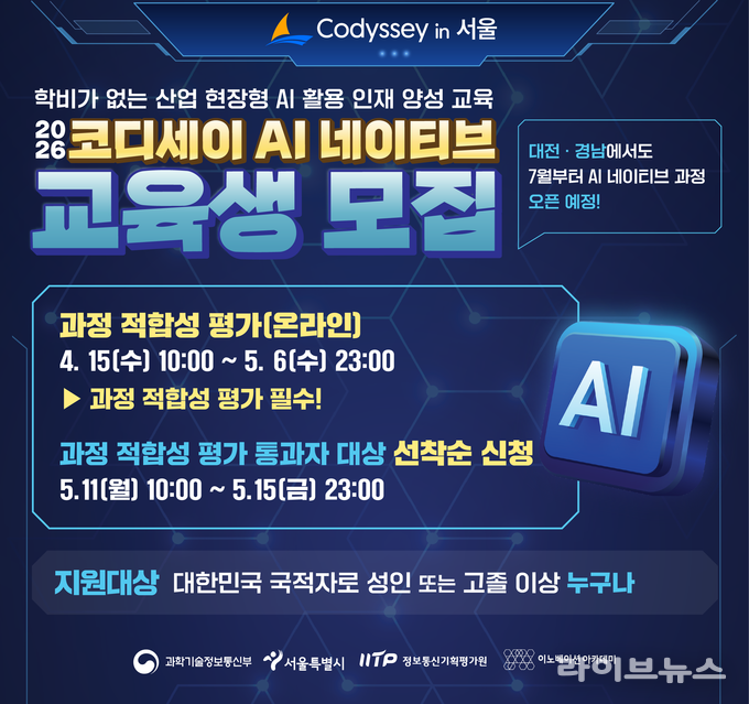 과학기술정보통신부(부총리 겸 과기정통부 장관 배경훈)와 정보통신기획평가원(원장 홍진배), (재)이노베이션아카데미(학장 김두현, 이하 이노베이션아카데미)가 코디세이의 두 번째 교육과정인 ‘코디세이 AI 네이티브 과정’ 설명회를 17일(금) 16시부터 이노베이션아카데미 유튜브 채널에서 개최한다.