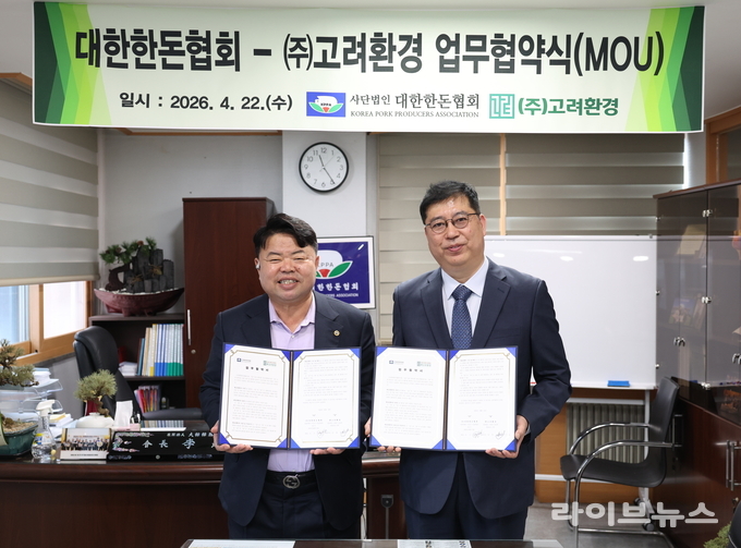 대한한돈협회는 22일 제2축산회관에서 고려환경과 친환경 축산분뇨 처리 및 냄새저감 기술 개발·보급을 위한 업무협약(MOU)을 체결했다. 이번 협약은 한돈산업의 환경 문제 대응과 지속가능한 농가 운영 기반 마련을 목표로 추진됐다.