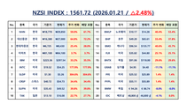 언론 통합 플랫폼이자 인터넷신문사 제보팀장을 운영 중인 더에이아이미디어는 1월 21일 NZSI INDEX 기반 시황 보고서를 발표했다. [편집자주] NZSI INDEX는 왜곡된 시장 정보에서 벗어나, 개인 투자자를 위한 공정하고 실질적인 투자 기준을 제시합니다. NZSI INDEX에는 미래를 설계할 수 있는 자본시장의 가능성이 담겨 있습니다. ★ 지수변경 : 1,000을 기준으로 종목 기여도 동일 반영 ★ 기 준 가 : 2024. 12. 20 / 1차 개편 : 2025. 04. 01 ★ 평가기준 : 20개 종목 X 5개 항목 (건전성, 안전성, 성장성, 위험도, 기대값) X 10등급 (A3 ~ D) 2026년 1월 21일 국내 증시는 혼조세를 보였다. 코스피 지수는 전 거래일 대비 0.49% 상승한 4,909.93포인트로 마감하며 사상 최고치를 다시 경신했다. 반면 코스닥 지수는 2.57% 하락한 951.29포인트를 기록하며 상대적으로 약한 흐름을 나타냈다. 대형주 중심의 상승과 중소형주 조정이 동시에 나타나는 전형적인 괴리 국면이 이어졌다. 거래대금은 코스피 약 27조 1천억 원, 코스닥 약 15조 2천억 원으로 집계됐다. 시가총액은 코스피 4,044조 1