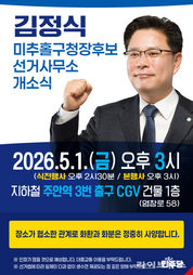 김정식 더불어민주당 미추홀구청장 후보가 선거사무소 개소식을 열고 본격적인 세 확산과 유권자 공략에 나선다. 김정식 후보 측에 따르면 개소식은 오는 5월 1일 오후 3시, 인천 미추홀구 염창로 58 주안CGV 건물 1층에서 개최될 예정이다. 이날 행사에는 지역 주민과 지지자, 관계자 등이 참석해 선거 승리를 위한 결의를 다지는 한편, 후보와 유권자 간 소통의 장으로 마련된다. 특히 이번 개소식은 6월 3일 지방선거를 앞두고 선거운동의 본격적인 시작을 알리는 계기로, 조직 정비와 지지층 결집을 강화하는 분수령이 될 것으로 보인다. 이 자리에서는 향후 선거 전략과 주요 정책 방향도 함께 제시될 예정이다. 행사는 주민 인사와 현장 소통을 중심으로 한 열린 형식으로 진행된다. 김정식 후보는 “이번 개소식은 구민이 주인이 되는 의미 있는 자리로 준비했다”며 “약동하는 미추홀구를 만들기 위해 최선을 다하겠다”고 밝혔다.