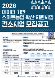 한국농업기술진흥원(원장 안호근, 이하 농진원)은 농림축산식품부와 함께 12월 15일부터 내년 1월 14일까지 ‘2026년 데이터 기반 스마트농업 확산 지원사업’의 사업 대상자를 모집한다고 16일 밝혔다. 이번 사업은 상용화된 스마트 장비를 통해 수집된 데이터를 활용해 영농 의사결정을 지원하는 서비스·솔루션을 보유한 기업과 농가로 구성된 컨소시엄을 선정해, 데이터 기반 스마트농업을 현장에 확산하는 목적이 있다. 디지털 전환과 인공지능 활용이 농업 경쟁력의 핵심 요소로 부각되는 가운데, 농가의 생산성과 효율성을 동시에 높이기 위한 정책적 필요성이 커지면서 추진됐다. 모집을 통해 총 23개 내외의 컨소시엄을 선정하며, 약 1,100호 이상의 농가에 스마트농업 서비스 보급을 지원할 계획이다. 접수 기간은 2026년 1월 14일까지이며, 지원 내용과 신청 방법 등 자세한 사항은 농진원 홈페이지 모집 공고문을 통해 확인할 수 있다. 특히 이번 사업은 전년 대비 지원 규모를 확대하고, 사업 목적에 맞춰 지원체계를 한층 고도화했다. 지원유형은 총 4개로, 컨소시엄 구성 방식과 확산 범위에 따라 차별화된 지원이 이뤄진다. 1개 기업과 50호 농가로 구성된 컨소시엄을 대상으로