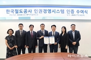 중소벤처기업인증원(원장 엄진엽, KOSRE)은 한국철도공사(코레일)가 인권경영시스템(HRMS) 인증을 획득했다고 밝혔다. 3일 코레일 본사에서 중소벤처기업인증원 엄진엽 원장, 코레일 권영주 인재경영본부장을 비롯해 양 기관 관계자들이 참석한 가운데 인권경영시스템 인증서 수여식이 진행됐다. 코레일은 이번 인증으로 그동안 인권경영 추진 체계를 구축하기 위한 노력과 실천 의지, 그리고 활동성과를 공식적인 검증을 통해 인정받게 됐다. 인권경영시스템 인증은 유엔 국제인권선언과 국가인권위원회 인권경영 가이드라인을 기반으로 한 요구사항을 ISO(국제표준화기구) 표준의 구조에 맞게 개발된 인증 제도다. 조직의 인권경영 프로세스 이행과 지속적 개선, 법규준수 기준과 이행, 인권 관련 리스크 분석·평가·이행 조치 실행 등이 주요 심사 대상이다. 정부 산하 인증기관 중에서는 중소벤처기업인증원이 유일하게 인권경영시스템 인증을 부여하고 있다. 코레일은 인권친화경영 실현을 위해 ‘존중’, ‘보호’, ‘확산’을 주요 가치로 삼아 인권존중 경영 내재화, 모든 이해관계자 인권보호 강화, 공급망 내 인권증진, 인권존중 실천문화 확산을 추진전략으로 설정했다. 또한 ChatGPT를 활용한 ‘고충