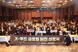 농림축산식품부(장관 송미령)는 23일 서울 양재동 에이티(aT)센터에서 2030년 K-푸드 수출 210억불 달성을 목표로, ‘케이(K)-푸드를 세계 시장을 선도하는 전략산업으로 육성’한다는 글로벌 비전을 선포했다. 비전 선포식에서 송미령 장관은 이재명 대통령의 축사를 대독했다. 이재명 대통령은 축사를 통해 “이번 선포식을 계기로 케이(K)-컬쳐의 대표주자인 케이(K)-푸드가 세계로 더 널리 뻗어나가길 바라며, 오늘 출범하는 ‘수출기획단’을 통해 케이(K)-푸드 확산을 위한 좋은 전략이 만들어지길 기대한다.”면서 “정부는 케이(K)-푸드가 내수를 넘어 전략수출산업으로 지속 성장할 수 있도록 든든하게 돕겠다.”고 밝혔다. 영상으로 축사를 보내온 어기구 국회 농림축산식품해양수산위원회 위원장은 “케이(K)-푸드는 우리 농업의 지속가능성과 식품산업 경쟁력을 키우는 국가 전략산업이다.”라면서 “국회 농해수위도 케이(K)-푸드가 세계로 더 뻗어나갈 수 있도록 든든히 뒷받침 하겠다.”고 밝혔다. 이어, 민간과 정부가 함께 유망 케이(K)-푸드를 선정하고 권역별 수출 전략을 기획하는 ‘케이(K)-푸드 수출기획단’(이하 수출기획단)을 공식 출범했다. 수출기획단은 농식품부 장관
